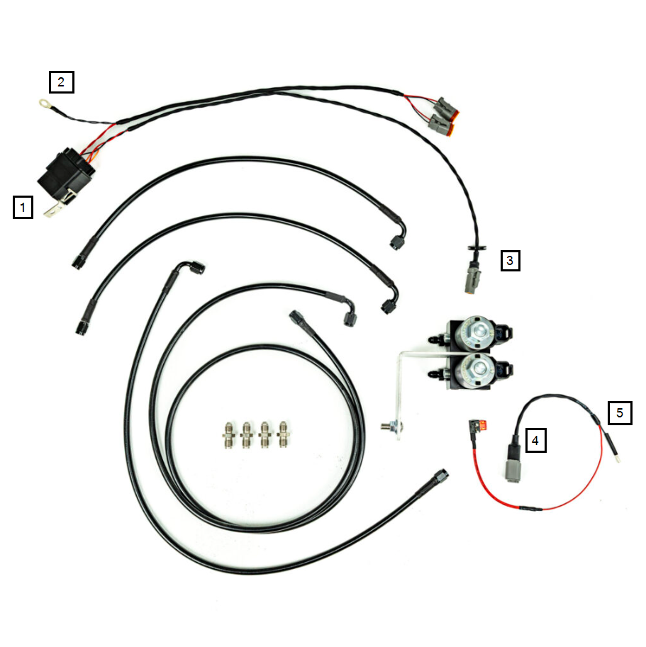 The V2 GT1R Line Lock Kit utilizes different solenoids, has slightly varied wiring, and different lines than the original kit, but installs nearly identically. Installation pictures will be from the first generation kit and differences in the second generation are corrected. The line lock kit is designed to install with the factory ABS pump and once configured in the ECU will allow the front wheels to be locked making RWD burnouts easier. Installation should be performed by a qualified mechanic and the ECU calibration will need to be configured by your tuner in order to ensure proper functionality. The parts list and notes for each is as follows: