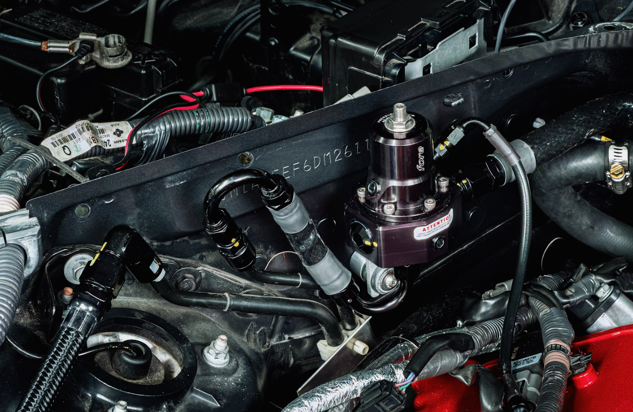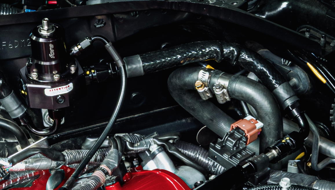 You can see the -08AN line with 90° and 0° hose ends and covered in fire sleeve running from the ethanol content sensor to the right side of the fuel pressure regulator above.