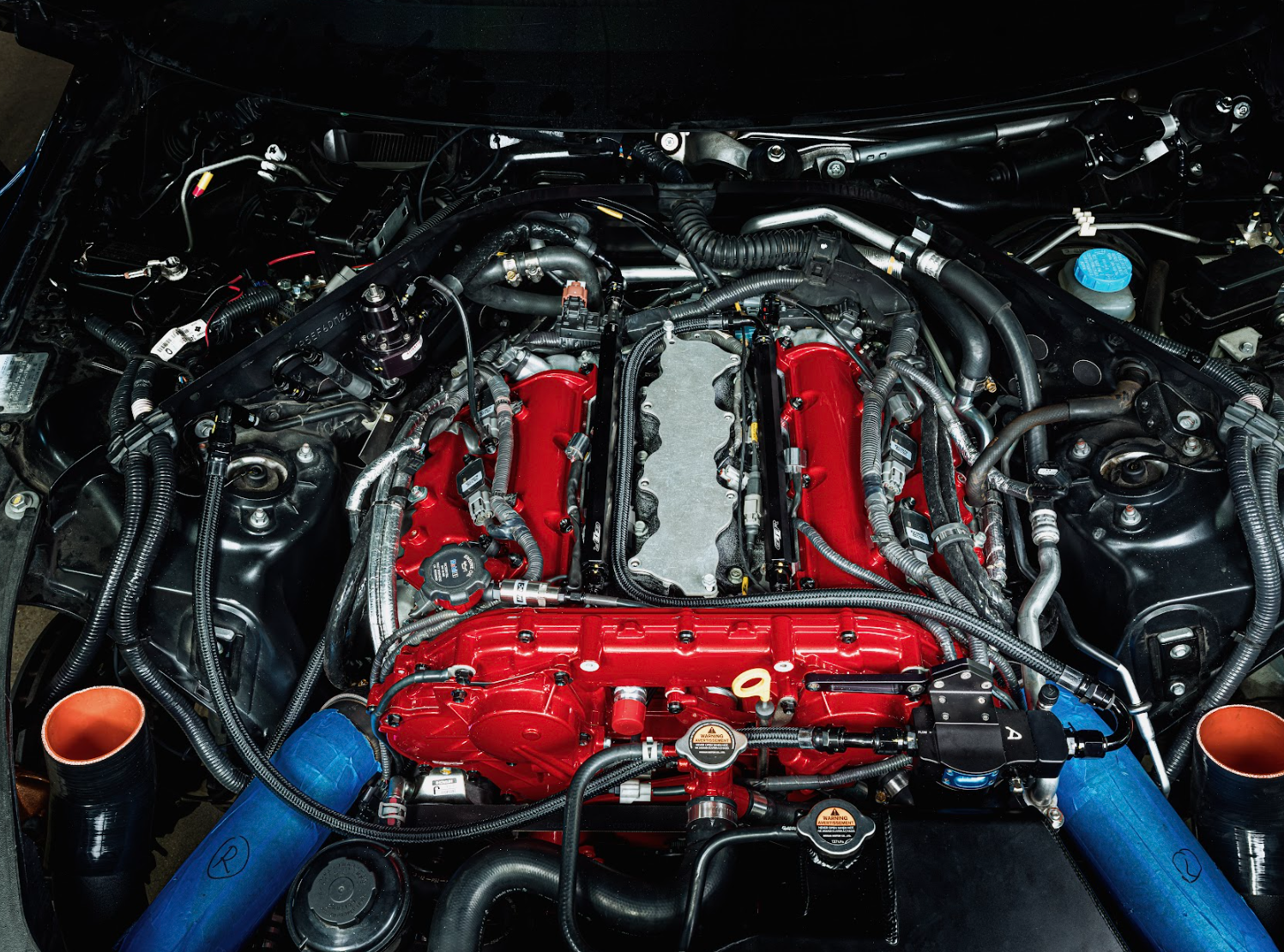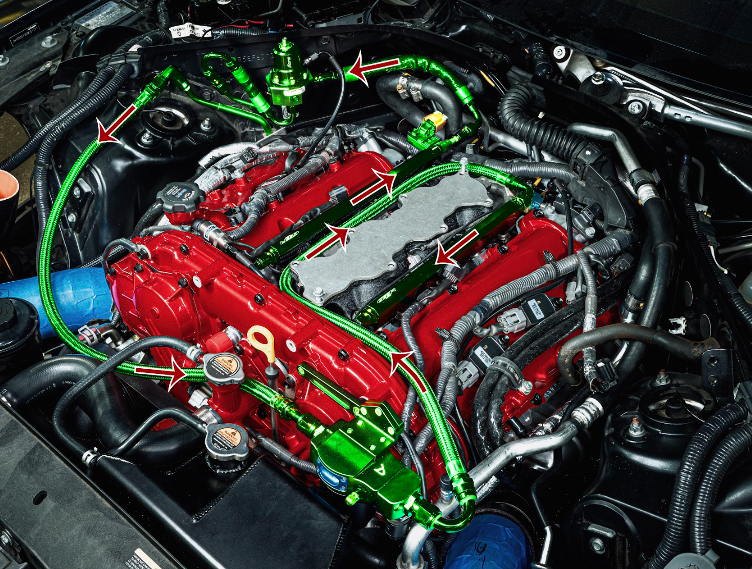 The T1 02.01.06 Complete Fuel System is designed to be installed on the R35 Nissan GT-R, in conjunction with most 6-injector intake manifolds, including OEM. As is the case with any fuel system related work, all work should be performed by a qualified mechanic on a cool engine and it is advised to disconnect the battery as well. This kit mates to the OEM main feed/return lines that run the length of the car and terminate at the engine bay firewall and by the OEM fuel hanger assembly.